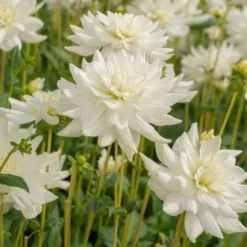 Dahlia ‘White Perfection’ shows off giant 8–10″ blossoms of crisp white with a touch of radiant yellow glowing at the centers. Decorative form.