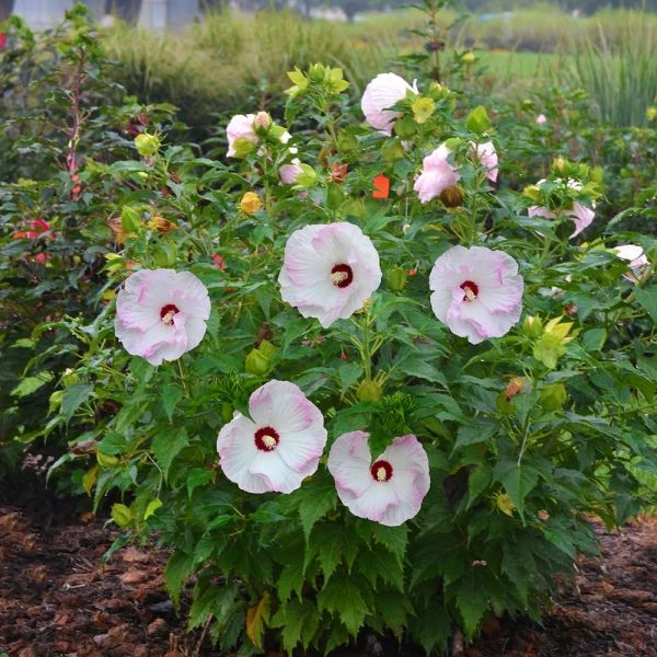 The large 7” blossoms on this Rose Mallow have overlapping, lightly ruffled petals that create a swirling sense of motion. The flowers arrive in multitudes from midsummer to fall, appearing from the top of the stems down to the bottom. The plant’s upright habit and fresh green, serrated leaves contribute to its prima status. Looks positively tropical, but it’s hardy even in zone 4. A Proven Winners® variety. PP 29,896