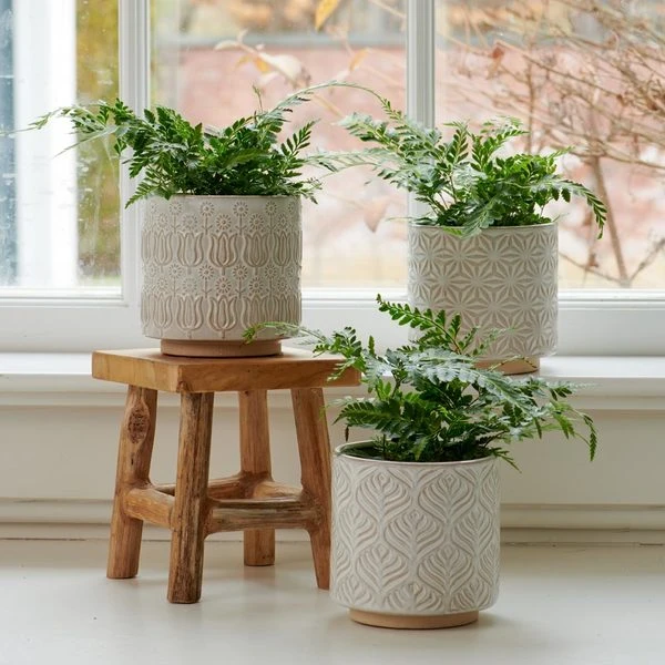 Intricate geometric and floral patterns add stylish presence to our Trio of Lokka Ceramic Pots, the sheer white glaze accentuating each of the designs while enhancing any plant or interior. The trendy but timeless pots are ideal for modestly sized houseplants including smaller Ferns and herbs. We ship an assorted trio of pots (our choice from designs shown in photo) so you can create a striking grouping of smaller houseplants. Lokka Ceramic Pots are terrific mates for our Teak Wood Plant Stands. Set of three.