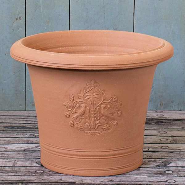 The great British designer William Morris once said: “Have nothing in your house that you do not know to be useful or believe to be beautiful.” Whichford Pottery’s Lovebirds Pot takes its inspiration from two of his designs, which are reimagined here in a classic medallion featuring two lovebirds amid an artful accent of grapevines. We recommend the use of larger bark mulch or a wire mesh screen to cover the drainage hole.