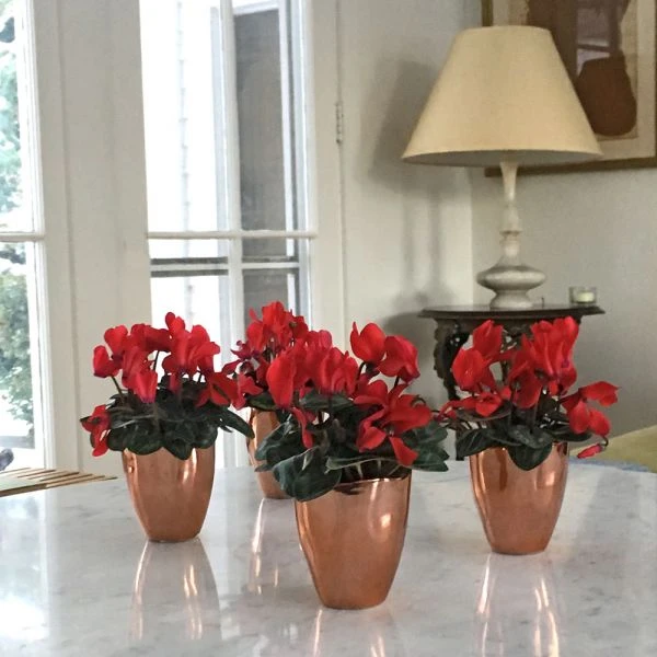 This fiery quartet of miniature red Cyclamen will create instant festive place settings for your holiday dinner table. Famed for their wintertime display, Cyclamen send up a long season of unique blossoms with their jet-fire petals thrown back. For a modern spin, we’ve tucked them in shiny, copper-colored cachepots that measure approximately 2″ wide x 3¼” tall. Set of 4.