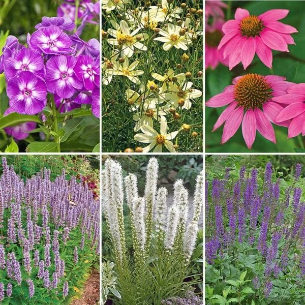 Our Pollinator Garden for Sun invites butterflies, bees, hummingbirds, and moths to frequent the banquet of your garden over a long season. These carefully selected plant varieties will keep pollinators—and flowers—coming from spring to frost. Our collection includes a total of 16 plants, and will cover about 36 sq ft. Quantity of each plant listed in parentheses below.