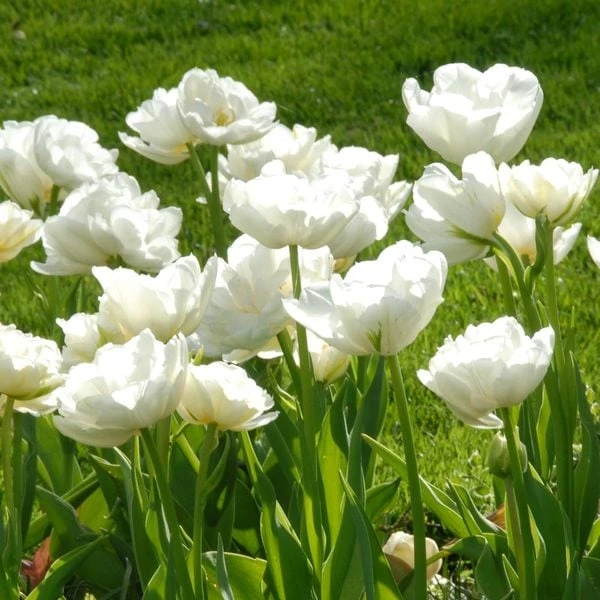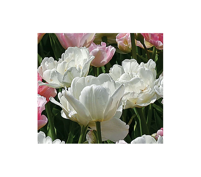 Tulip ‘Mount Tacoma’ buds are pink and green, but the long-lasting flowers open creamy white. A great complement to the pink of ‘Angelique’ or almost anything else in your garden. Heirloom, pre-1924.